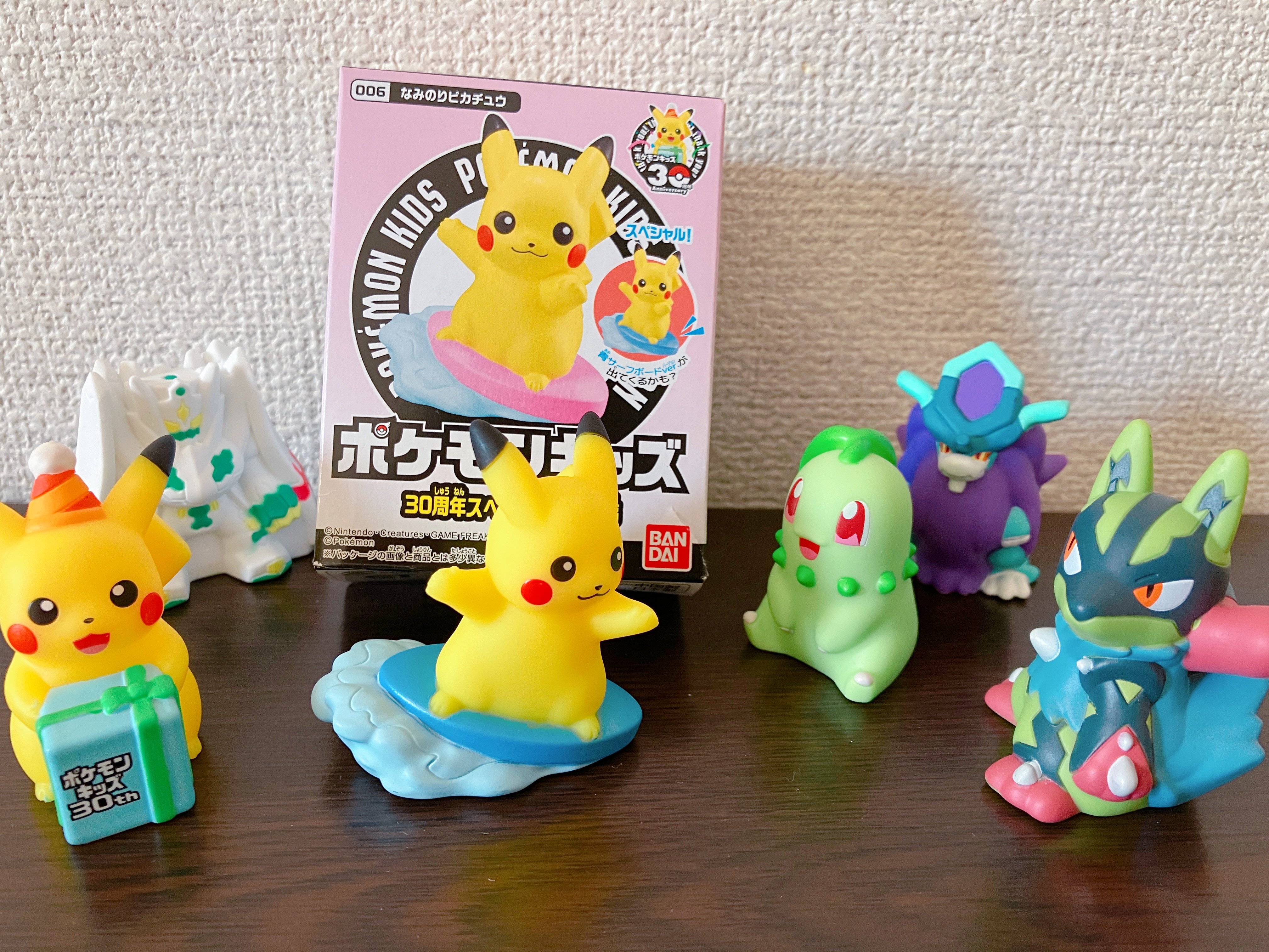 ウネルミナモ、黄色いルカリオ、30周年お祝いピカチュウ、波乗りピカチュウ、