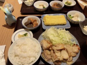 15日の昼ごはんは、鶏肉とエリンギのゆず味噌炒め定食と卵焼き。